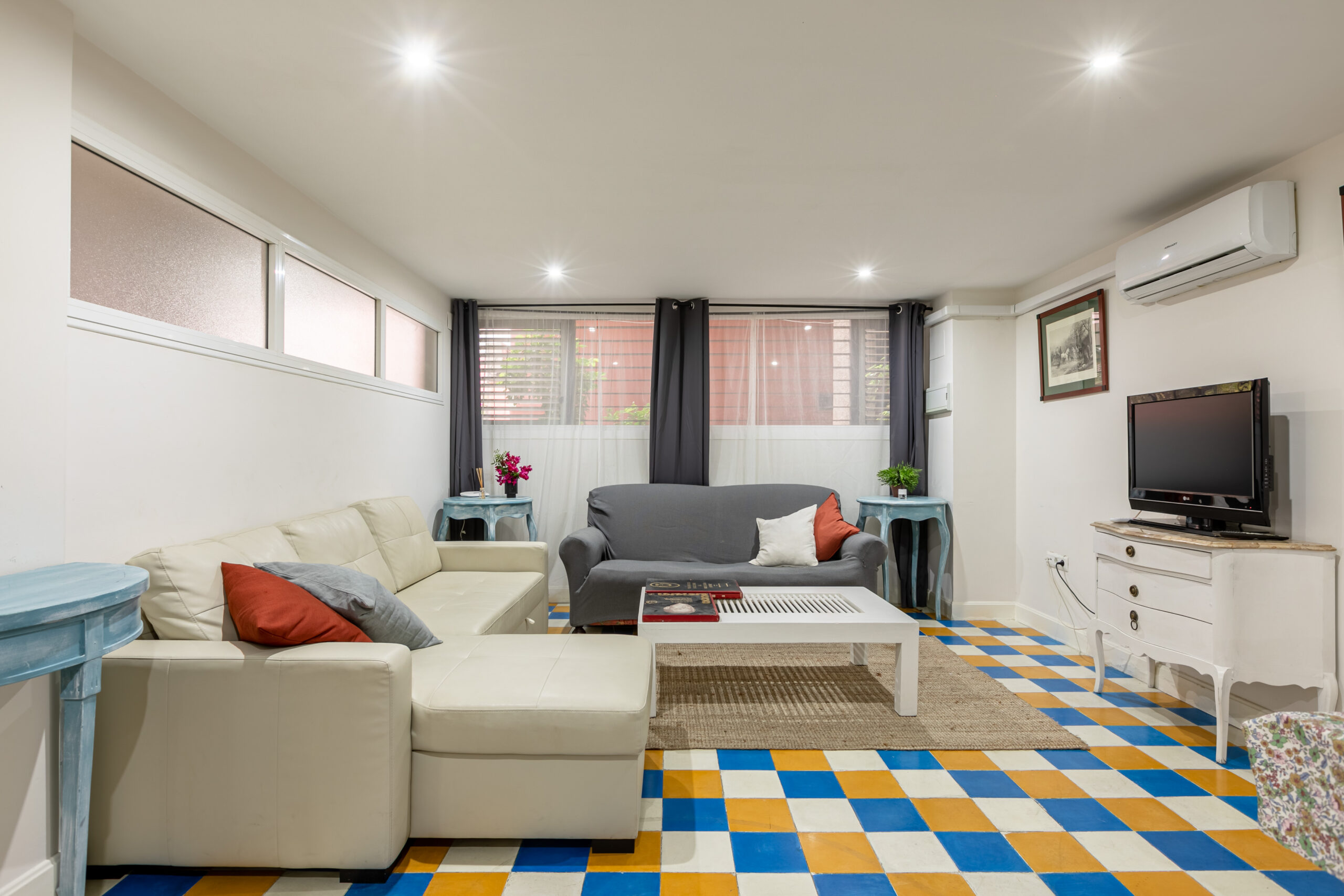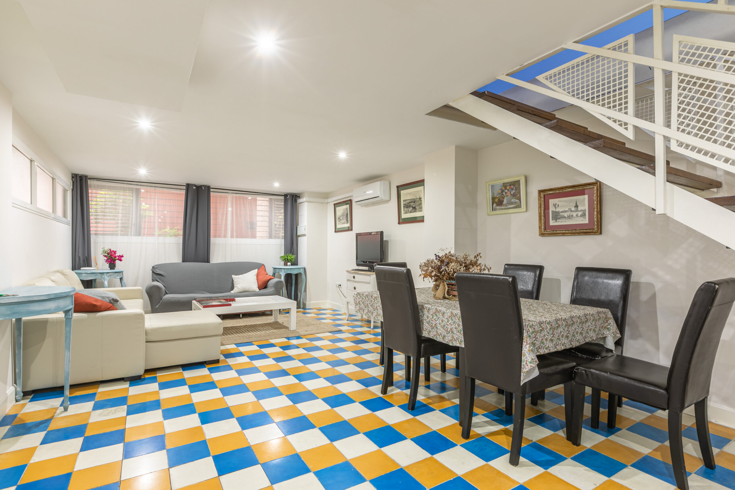Cet appartement de 115 m² sur deux étages comprend un salon spacieux avec un canapé-lit double, une kitchenette et des toilettes au rez-de-chaussée.